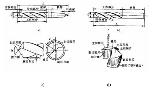 钻头的工作部分包括切削部分和导向部分,导向部分有两条螺旋槽和两条棱边,螺旋槽起排屑和输送切削液的作甲,棱边起导向、修光孔壁的作用。导向部分有微小的倒锥度,从前端到尾部每 100mm 长度上直径减少 0.03 ~ 0.12mm ,以减少与孔壁的摩擦,切削部分由两条主切削刃、两条副切削刃和一条横刃及两个前刀面和两个后刀面组成。螺旋槽的一部分为前刀面,钻头的顶锥面为上后刀面。麻花钻的主要几何角度有螺旋角β,前角γ,后角α 0 ,锋角 2 φ和横刃斜角ψ。